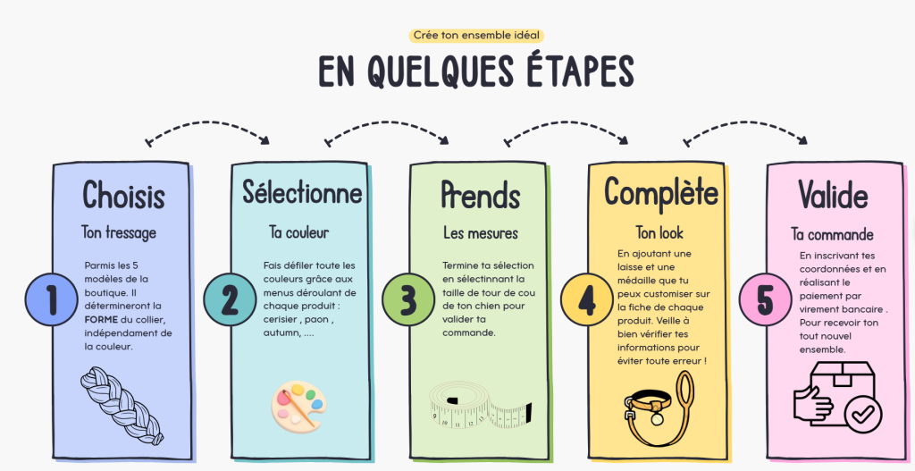 Colliers en paracorde, laisses solides et médailles personnalisées : chaque création est réalisée avec une attention particulière portée au confort du chien, à la résistance, la facilité d’entretien des matériaux et à la qualité des finitions.